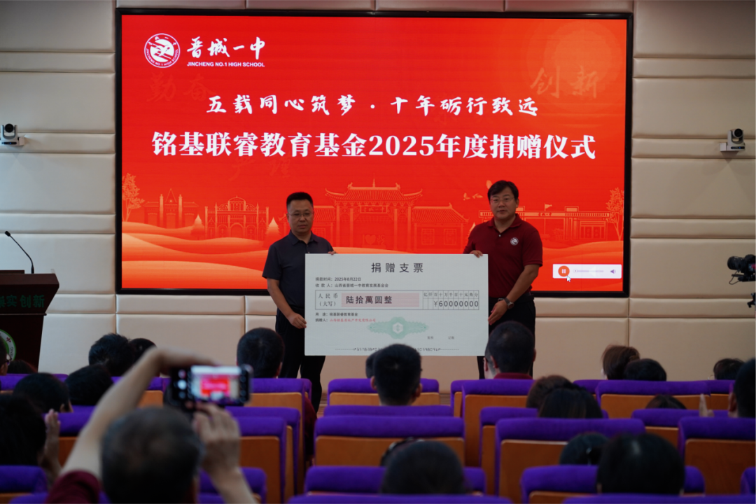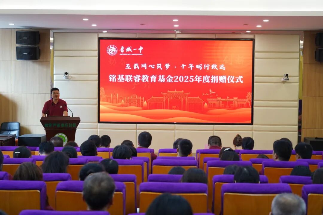 2025年8月22日,山西铭基房地产开发有限公司董事长刘军一行走进校园,再度捐赠60万元践行十年承诺,以赤诚之心助力晋城一中教育事业发展。