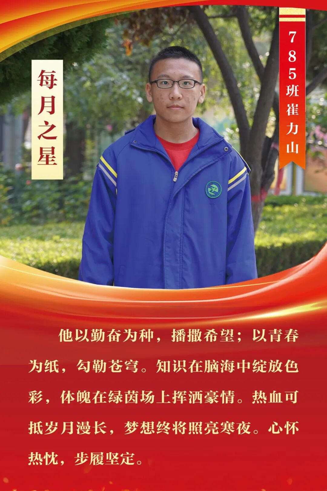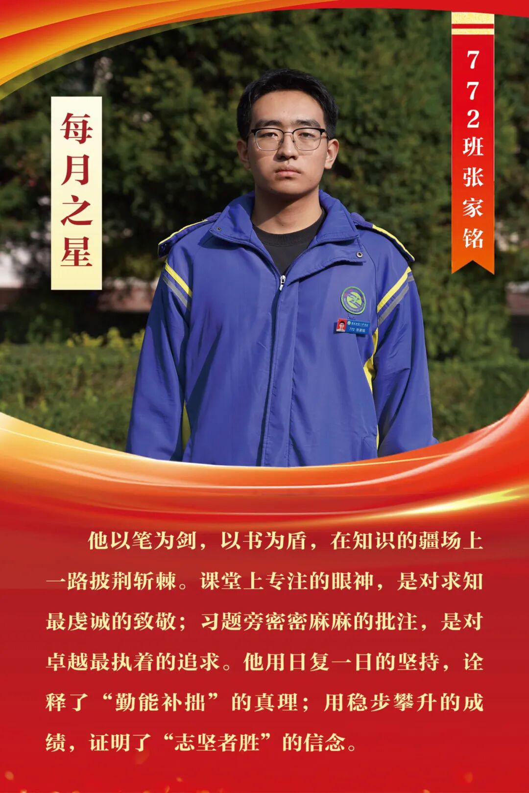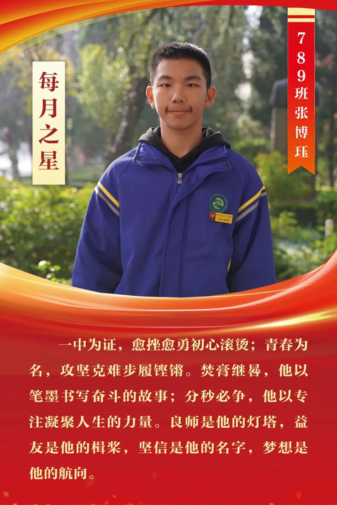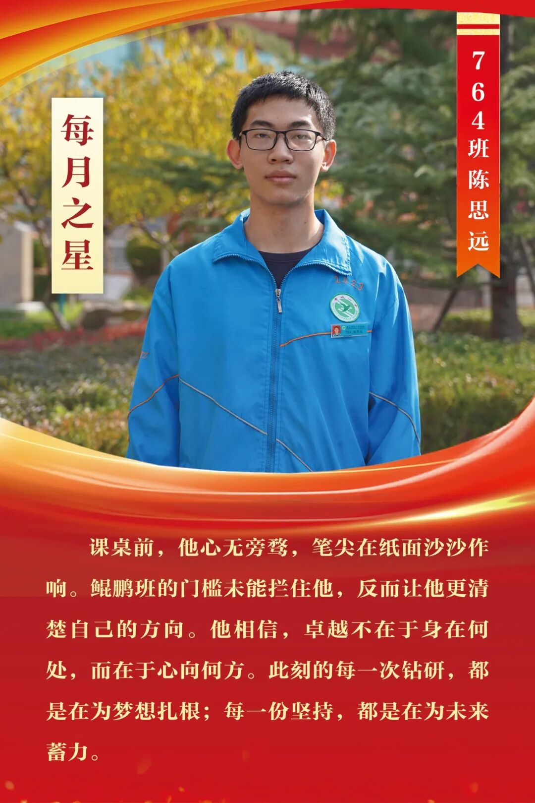 “每月之星”不是为了推举成绩最好的学生,所有积极阳光、热爱运动、乐观向上、坚强不息、正直善良的学生,都是我们渴望展示的对象。