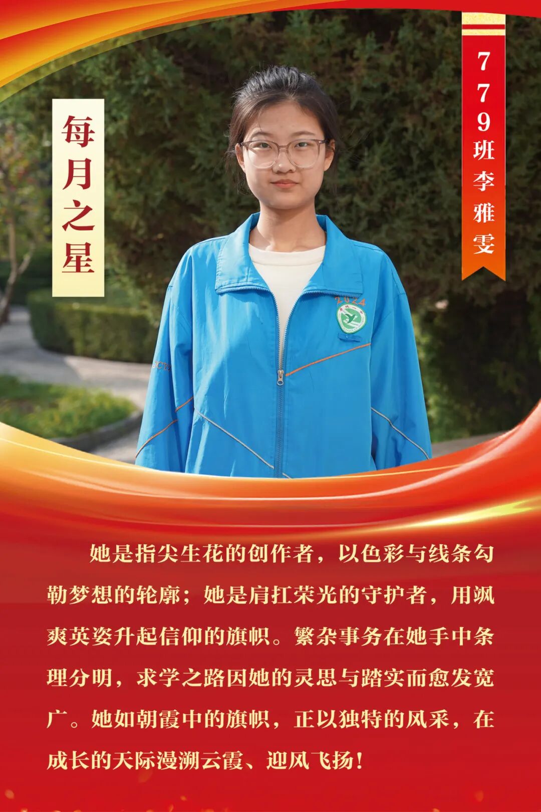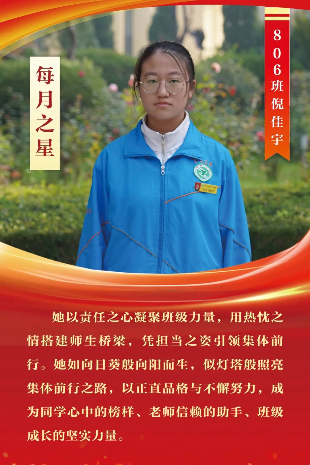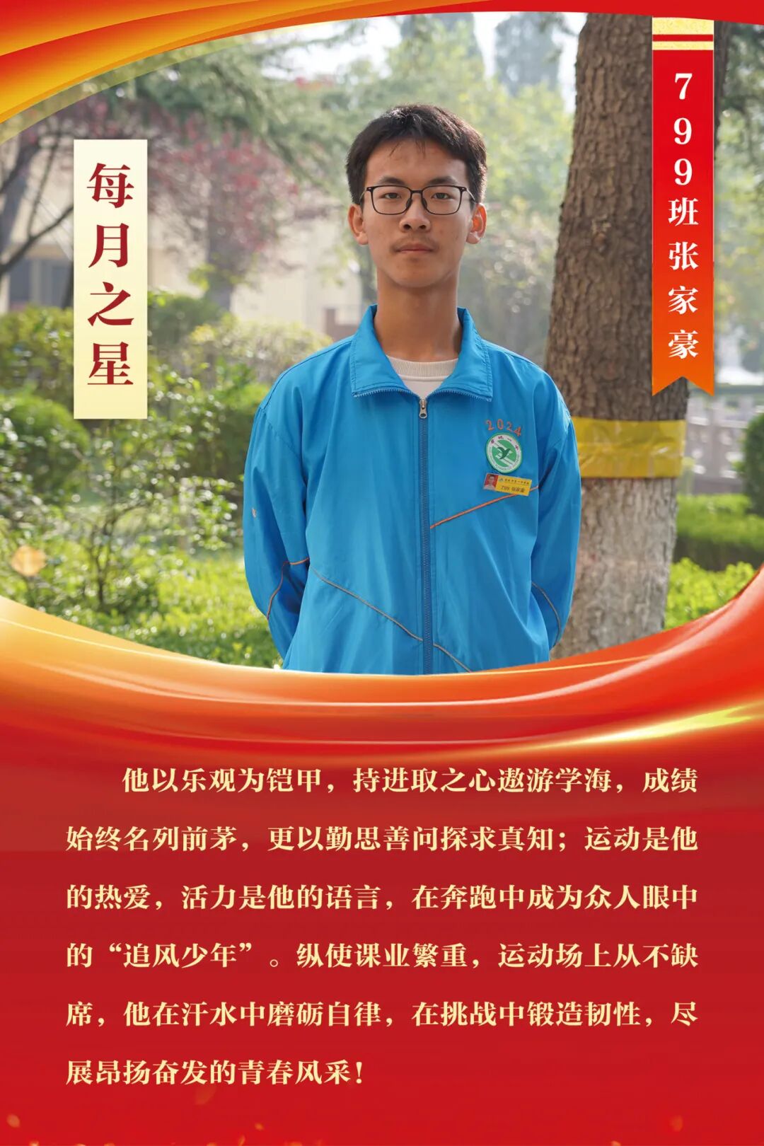 “每月之星”不是为了推举成绩最好的学生,所有积极阳光、热爱运动、乐观向上、坚强不息、正直善良的学生,都是我们渴望展示的对象。