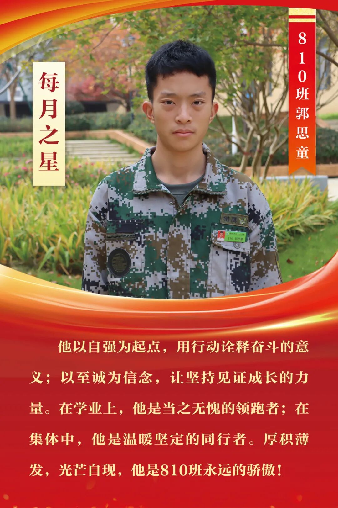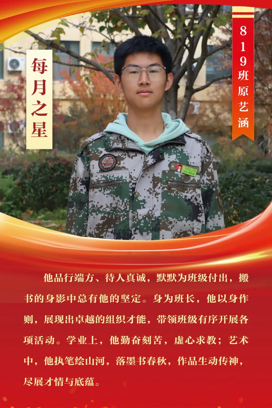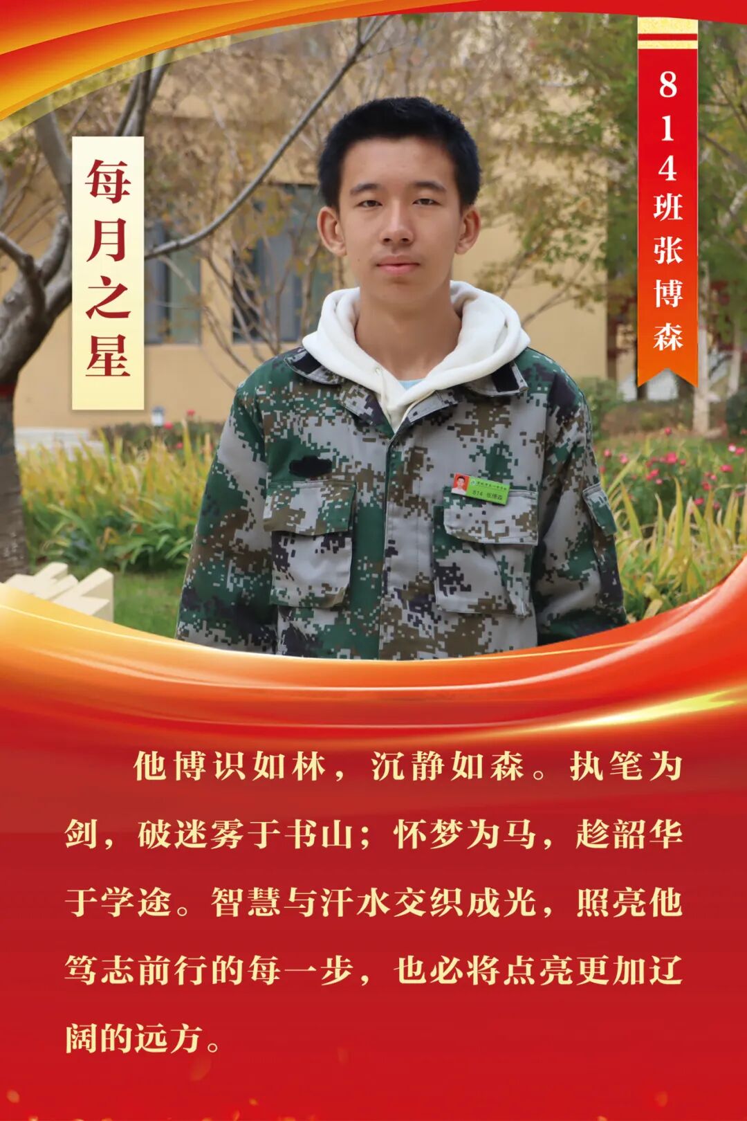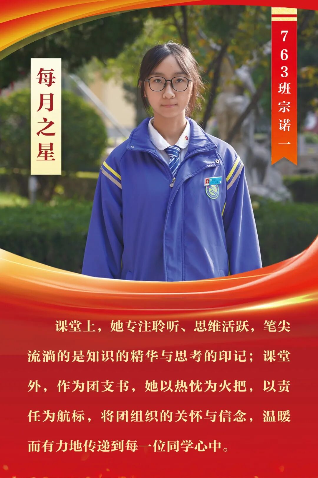“每月之星”不是为了推举成绩最好的学生,所有积极阳光、热爱运动、乐观向上、坚强不息、正直善良的学生,都是我们渴望展示的对象。