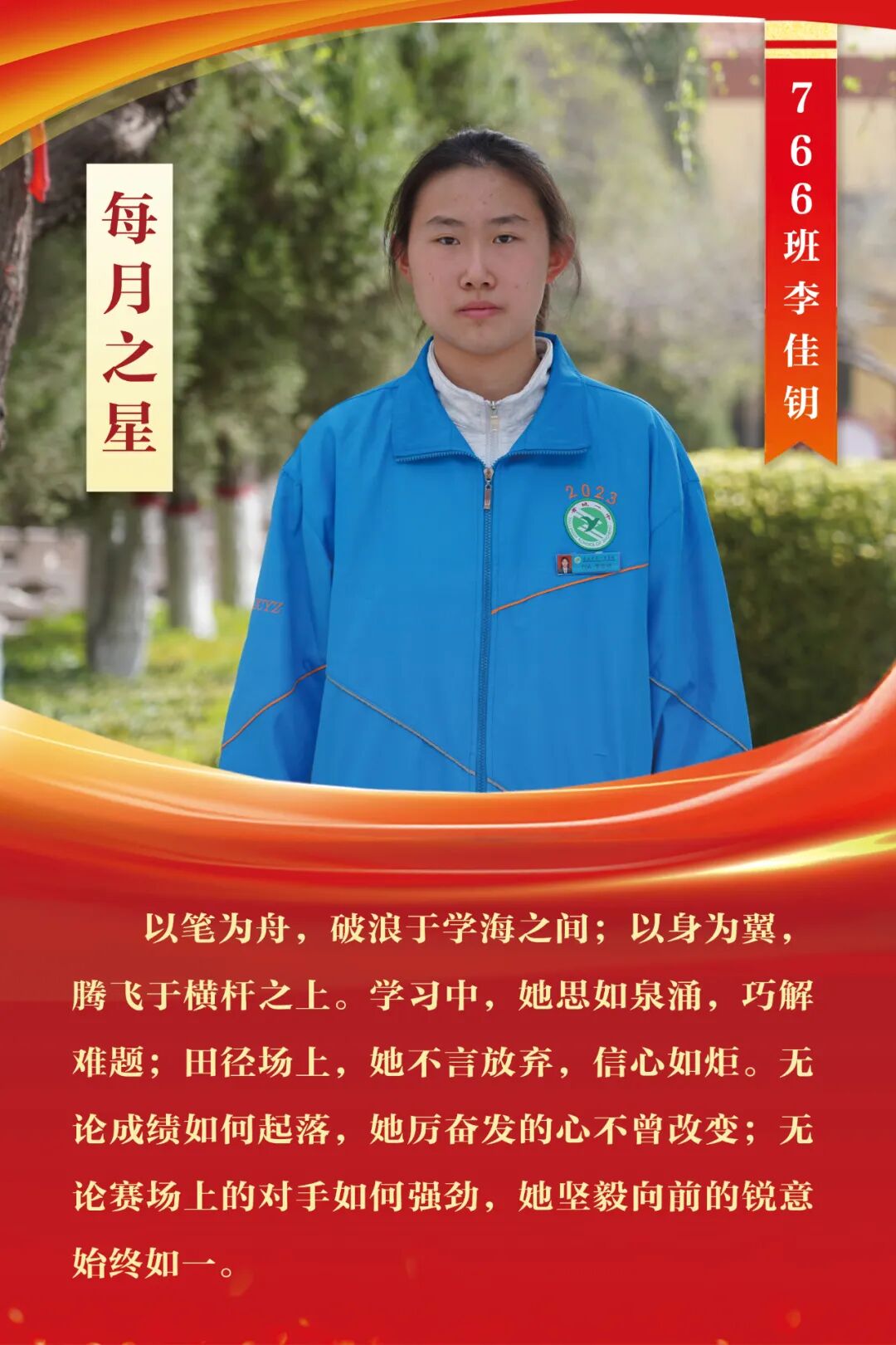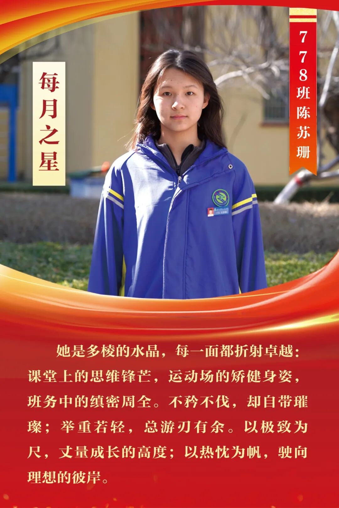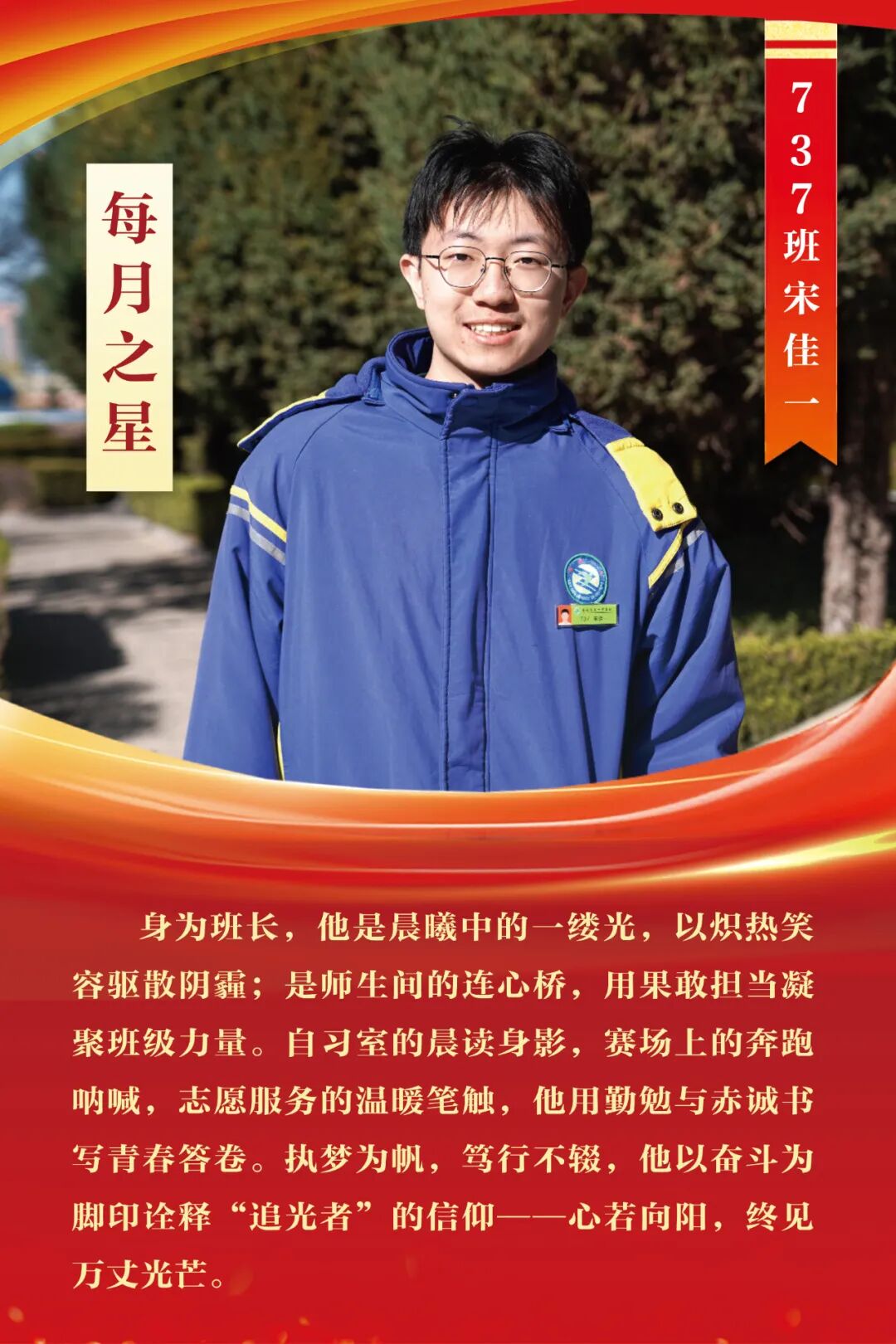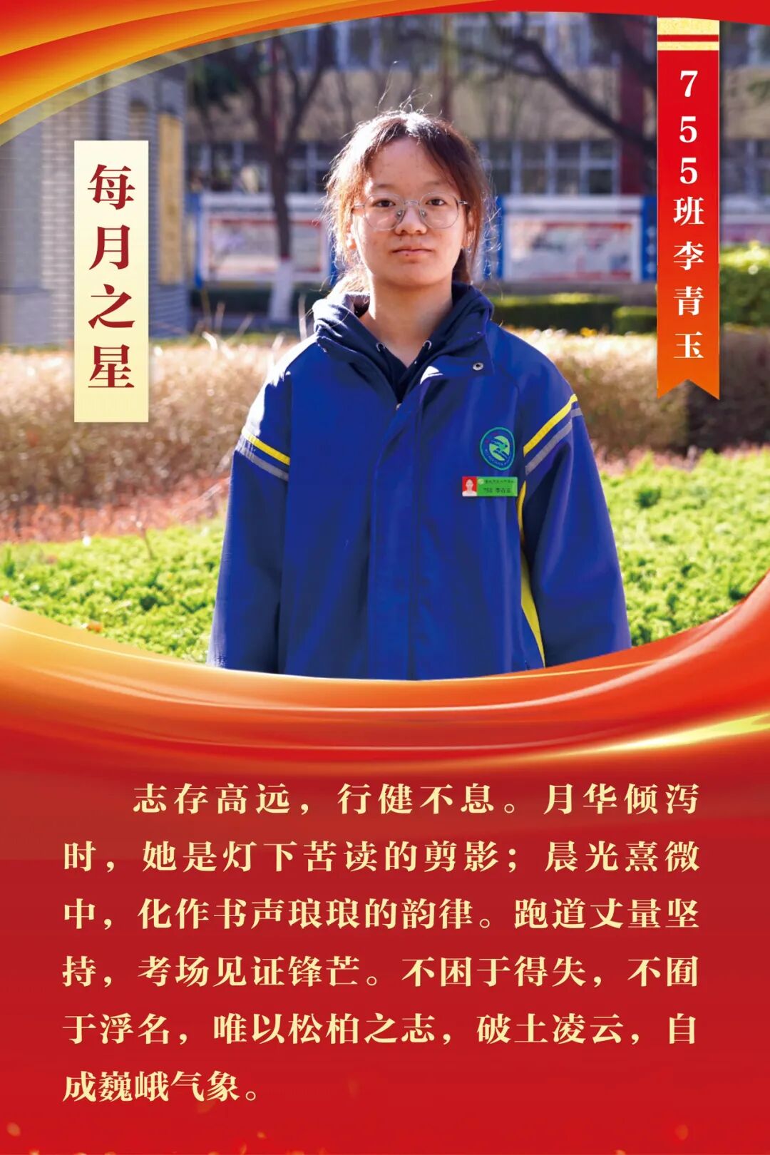 “每月之星”不是为了推举成绩最好的学生,所有积极阳光、热爱运动、乐观向上、坚强不息、正直善良的学生,都是我们渴望展示的对象。
