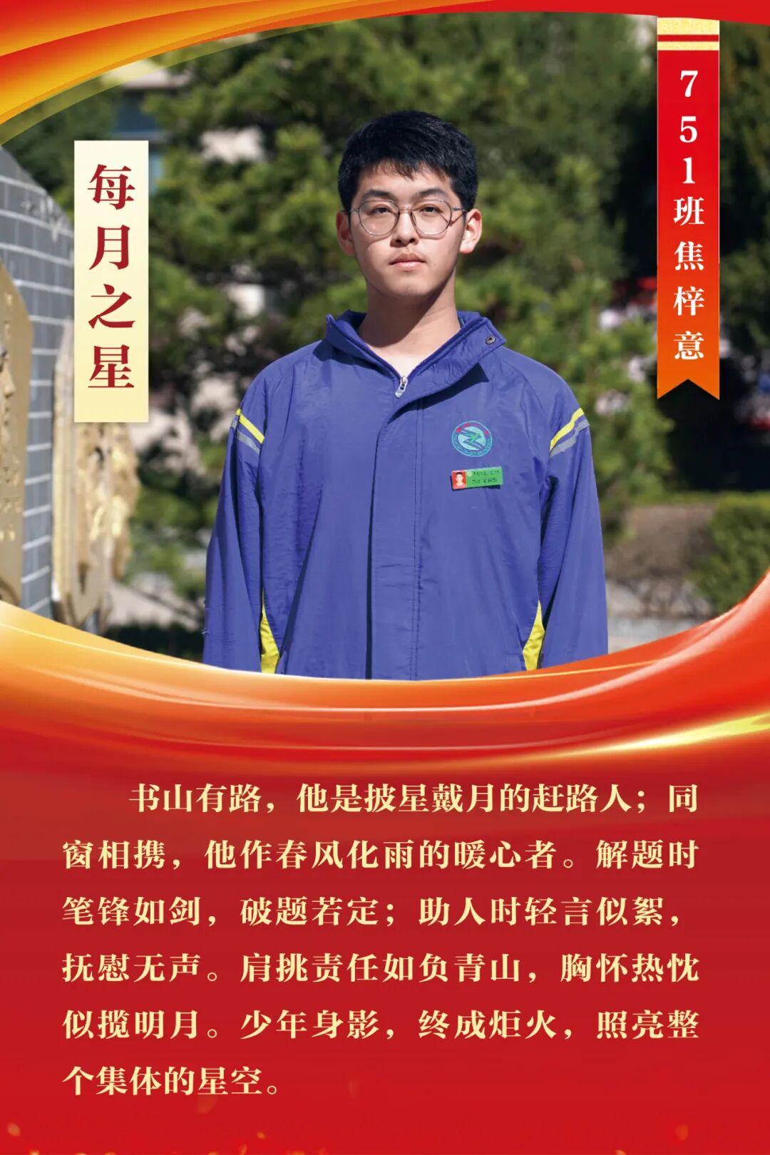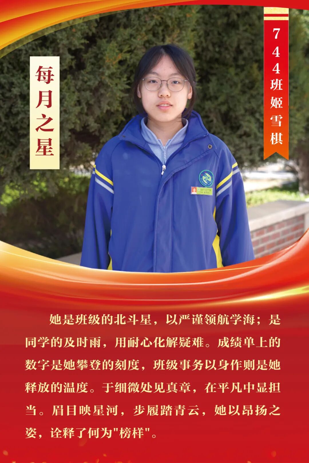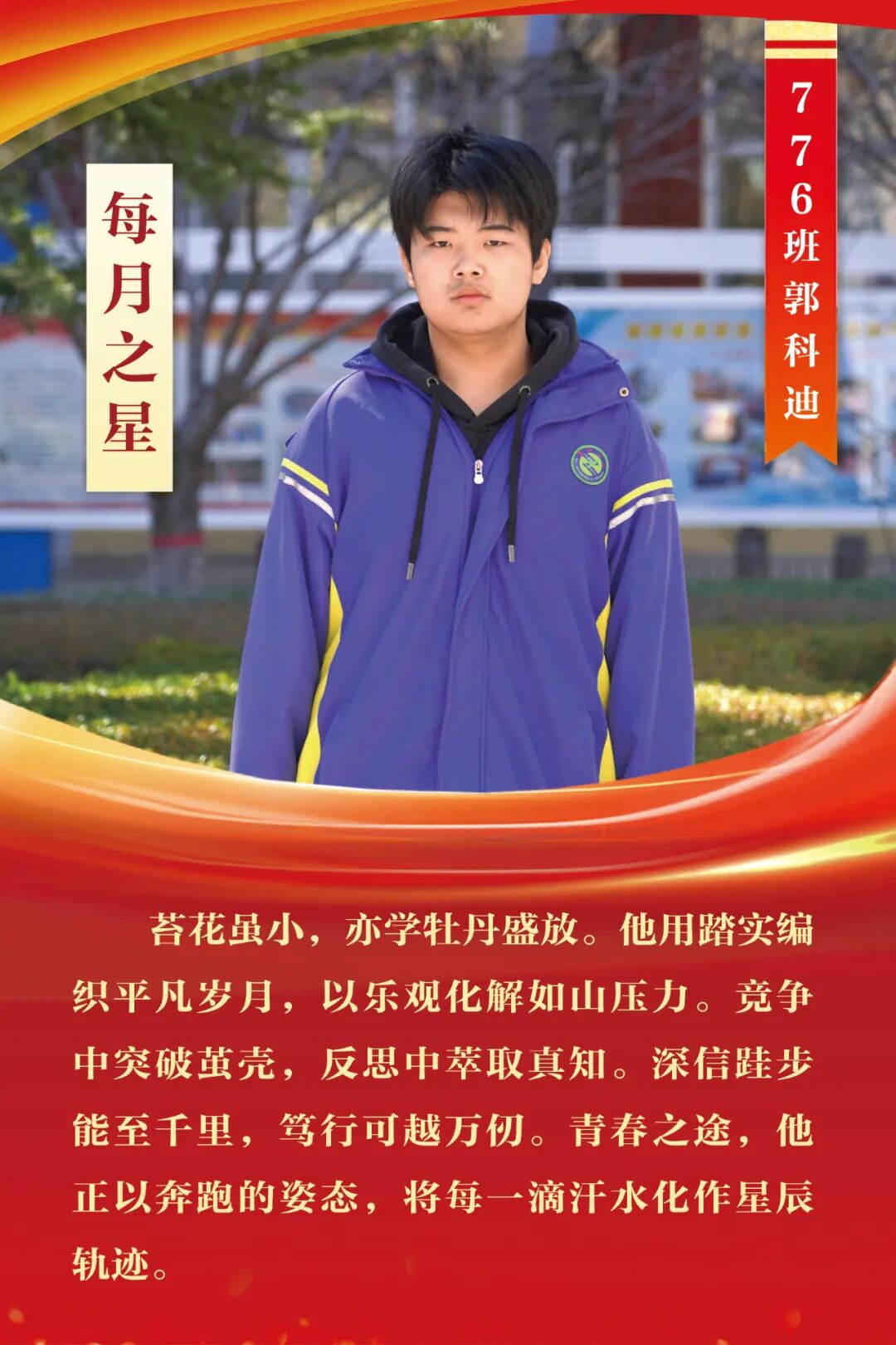 “每月之星”不是为了推举成绩最好的学生,所有积极阳光、热爱运动、乐观向上、坚强不息、正直善良的学生,都是我们渴望展示的对象。