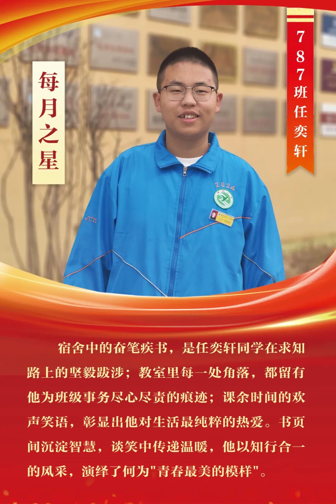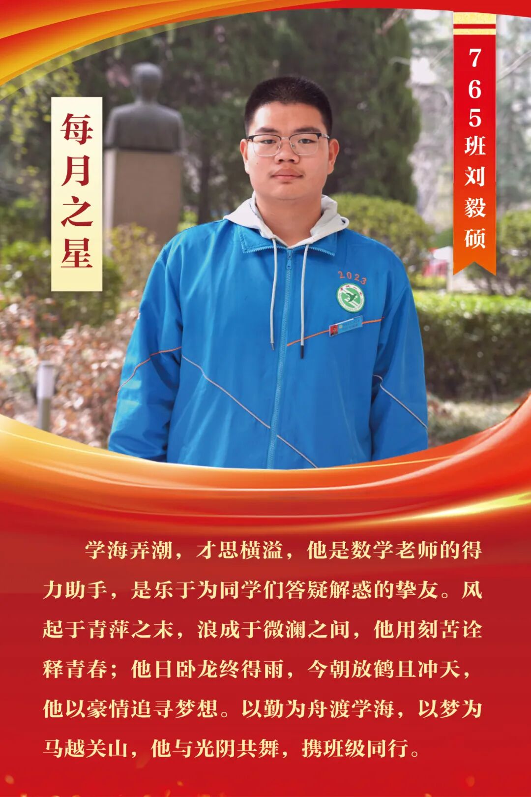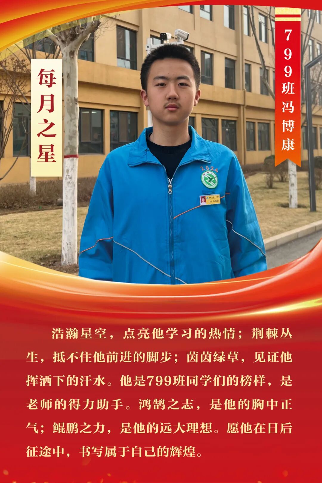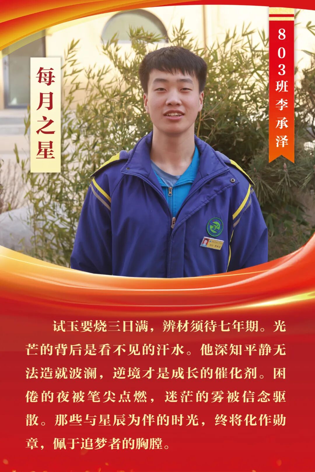 “每月之星”不是为了推举成绩最好的学生,所有积极阳光、热爱运动、乐观向上、坚强不息、正直善良的学生,都是我们渴望展示的对象。