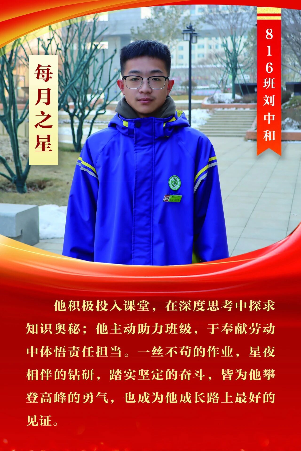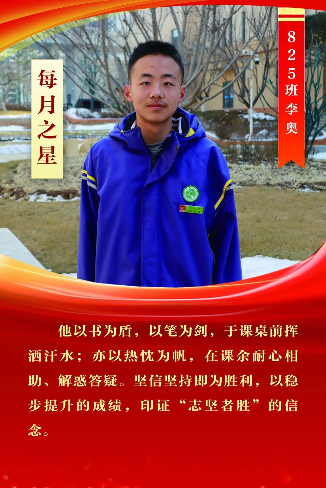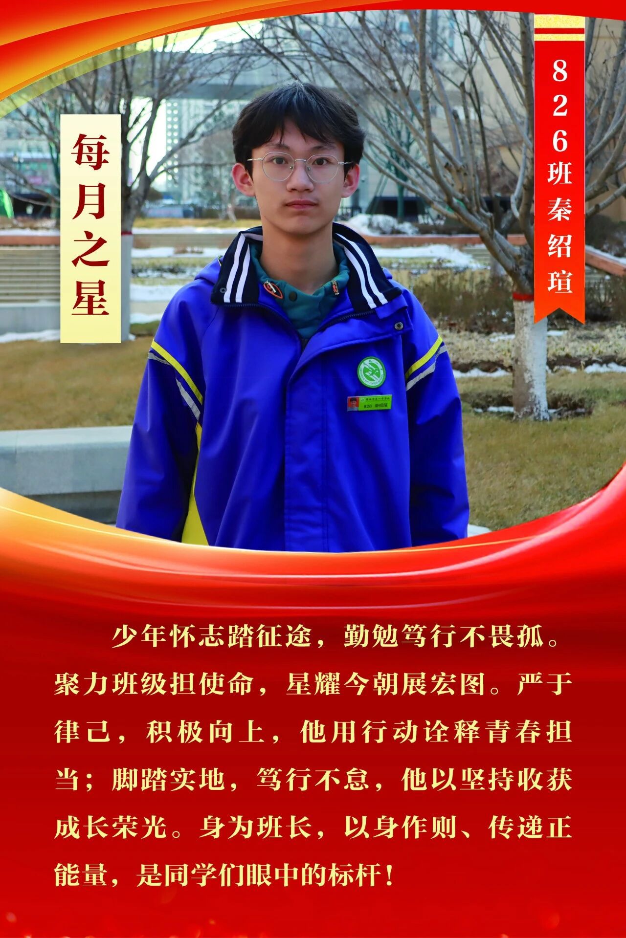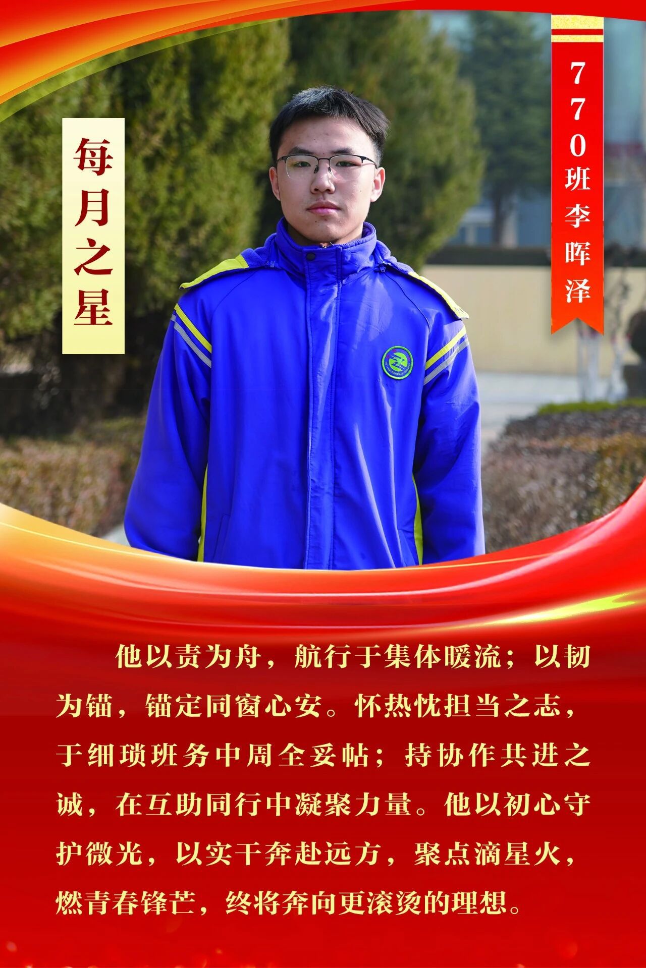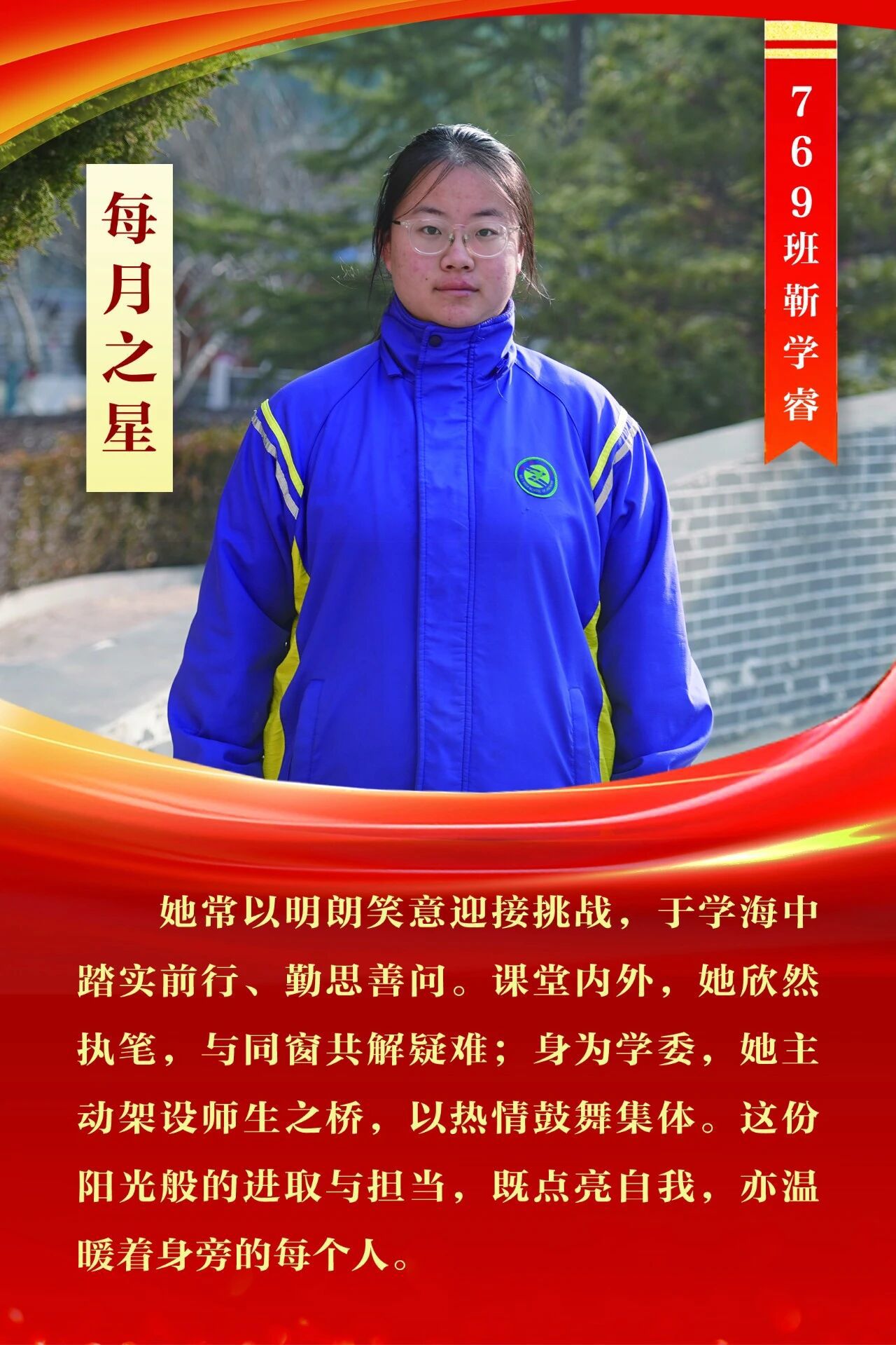 “每月之星”不是为了推举成绩最好的学生,所有积极阳光、热爱运动、乐观向上、坚强不息、正直善良的学生,都是我们渴望展示的对象。