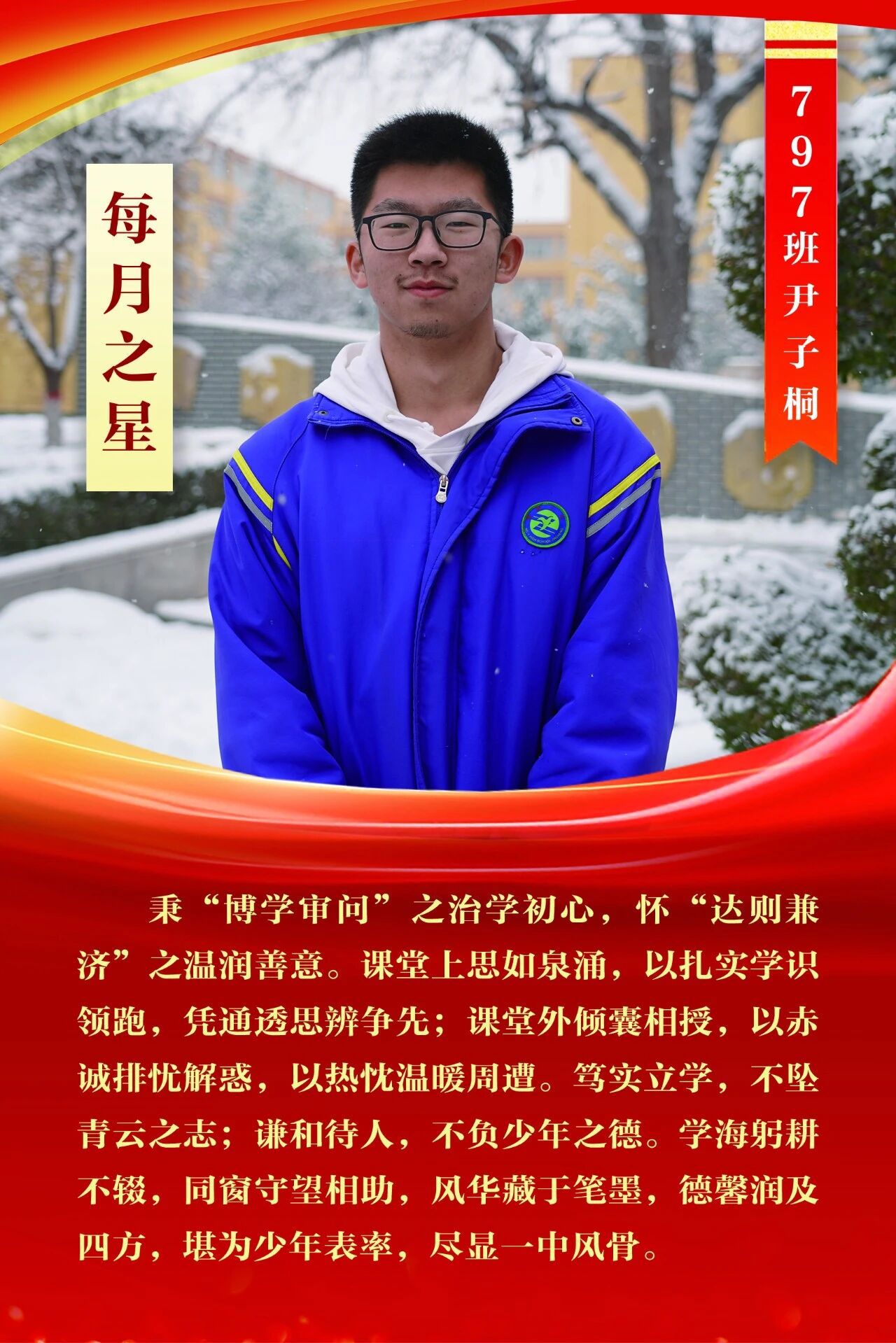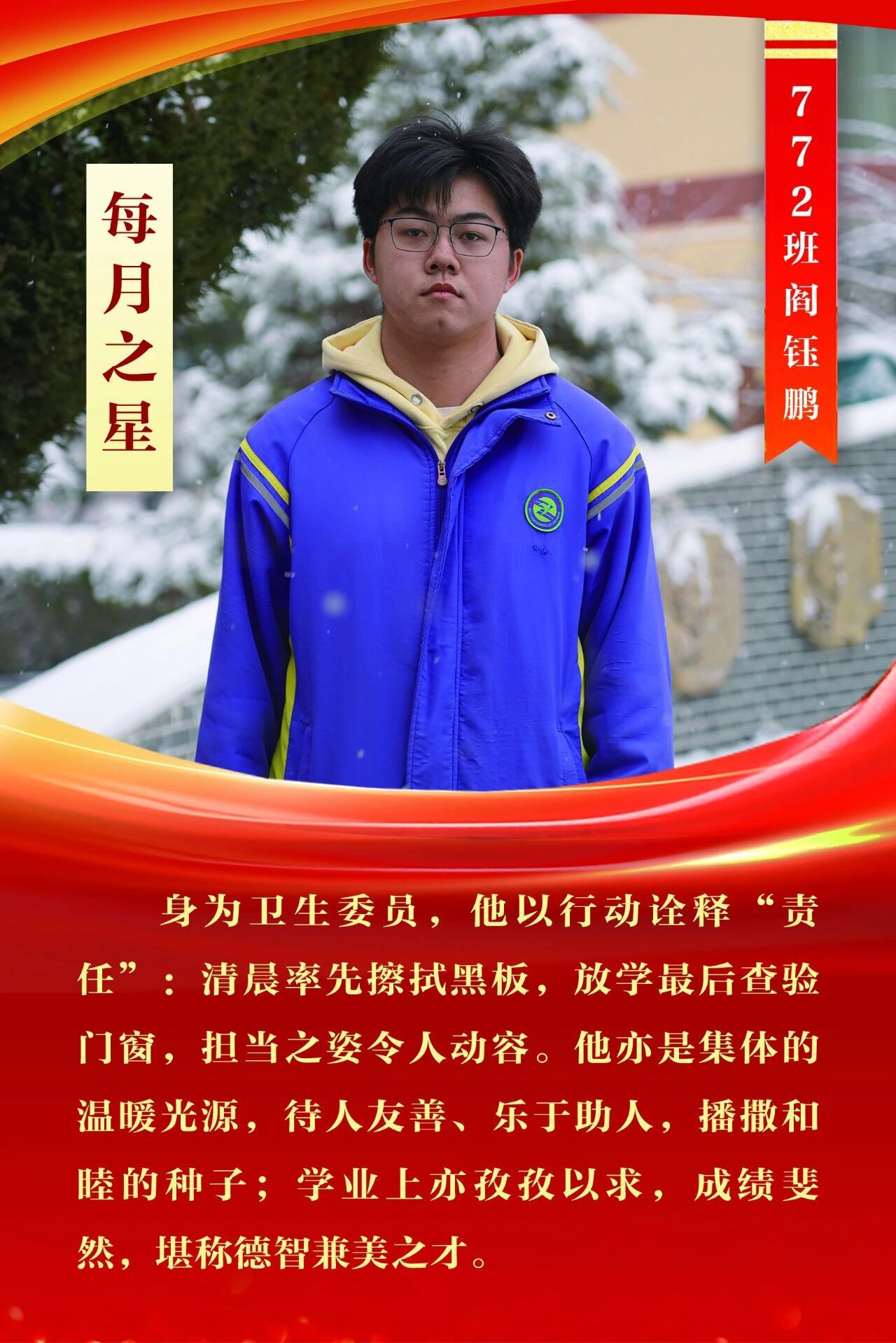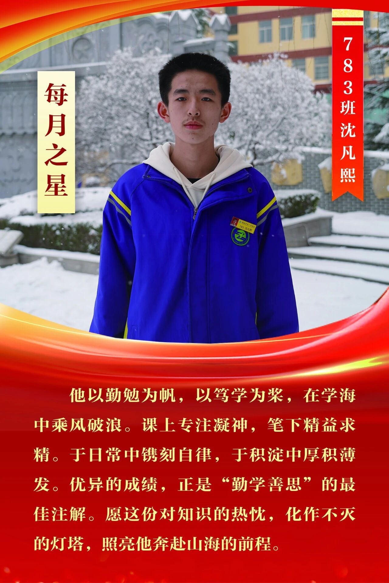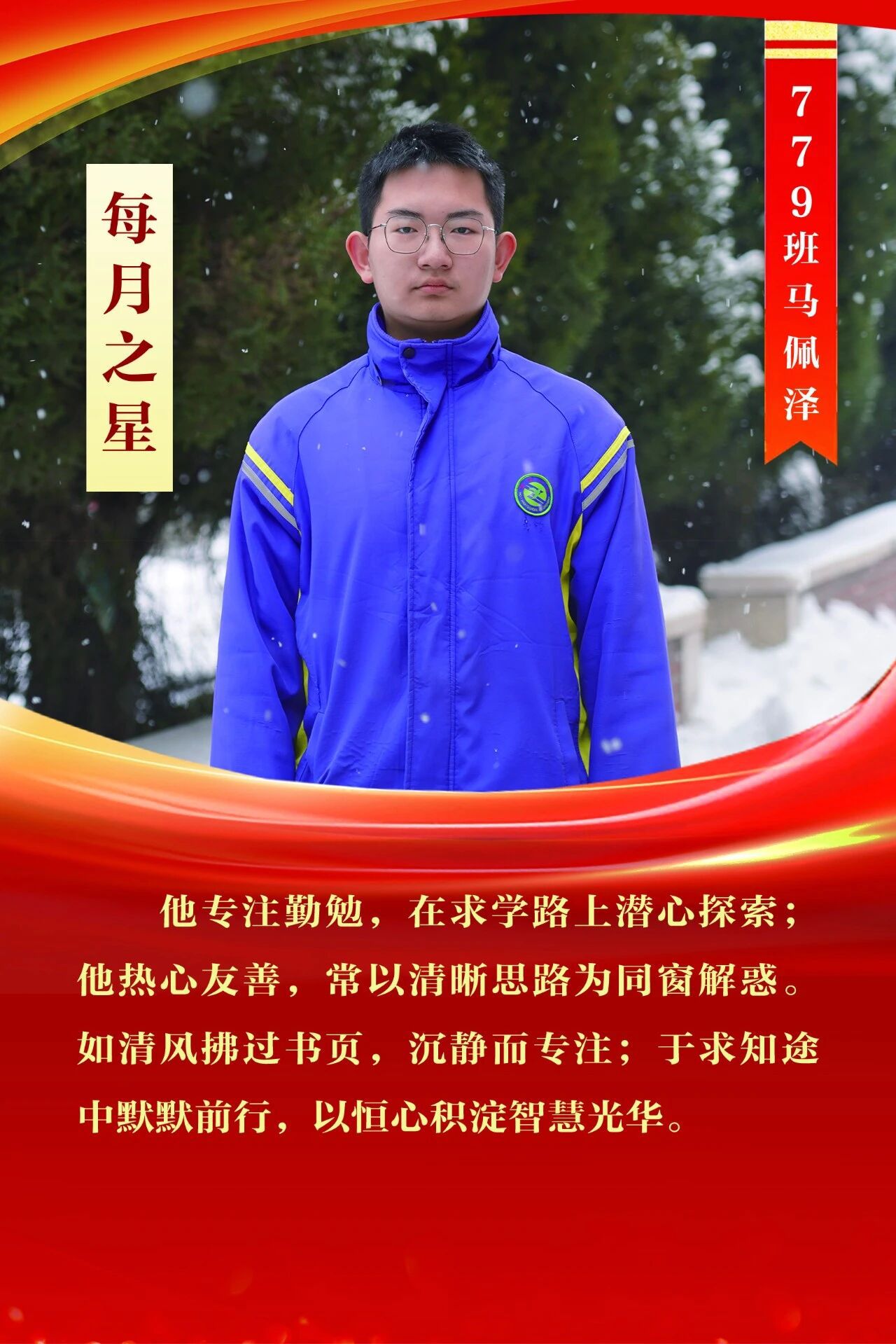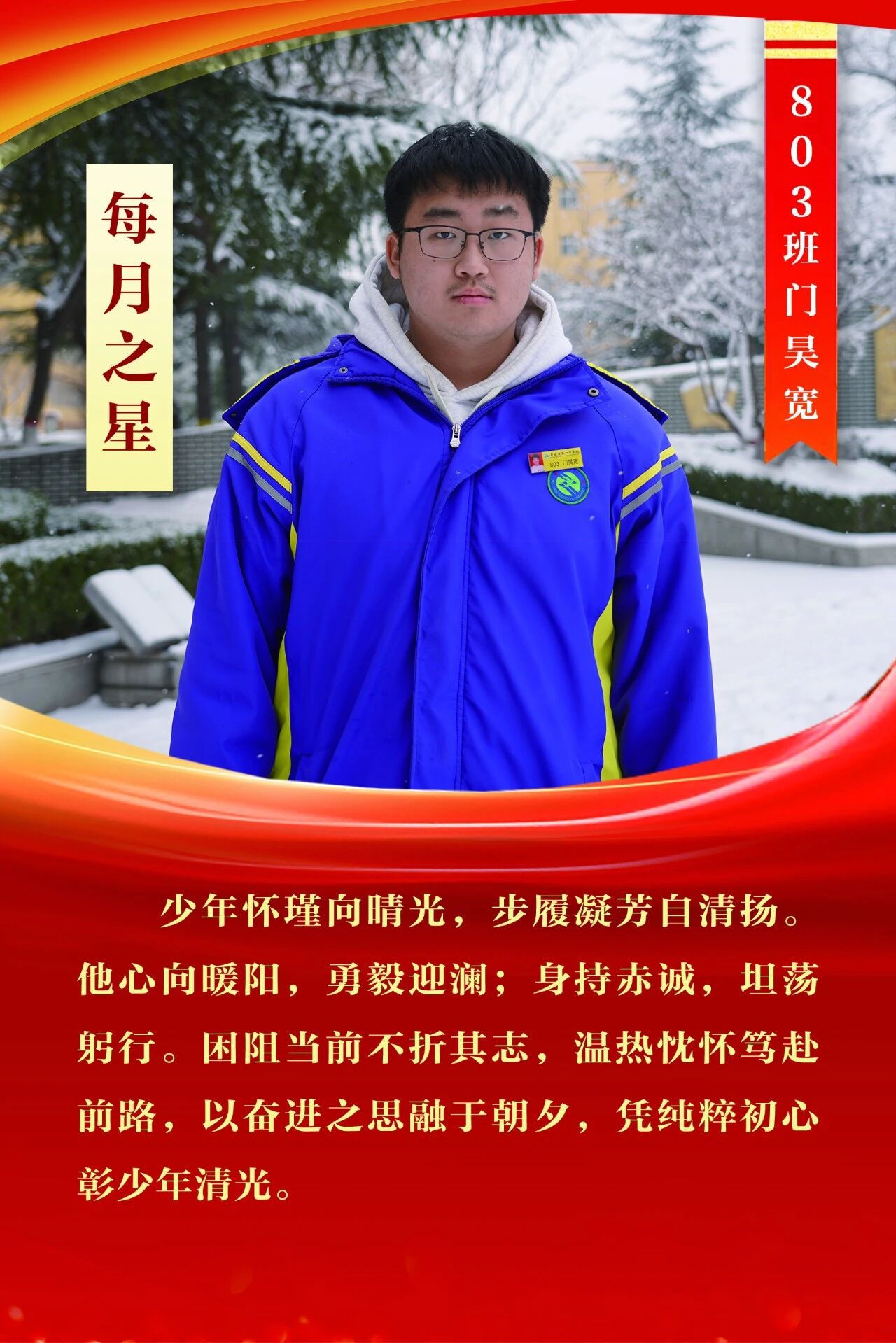 “每月之星”不是为了推举成绩最好的学生,所有积极阳光、热爱运动、乐观向上、坚强不息、正直善良的学生,都是我们渴望展示的对象。